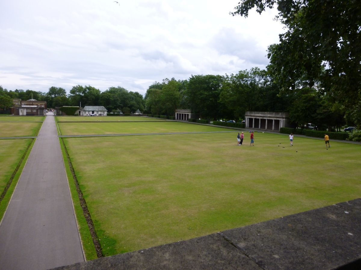 Some 80m north-west of the cafe there is a set of six bowling greens, in a sunken area overlooked by two shelters with Tuscan columns on the south-west side, a club house with changing rooms on the south-east side, and a pavilion on the north-west side. The walled edges of this area consist of a mixture of brick, including bricks of differing sizes, and artificial stone blocks, reflecting the close attention to surface texture and colour which is evident throughout the park. Between this area and the cafe there is a car park and a maintenance yard.