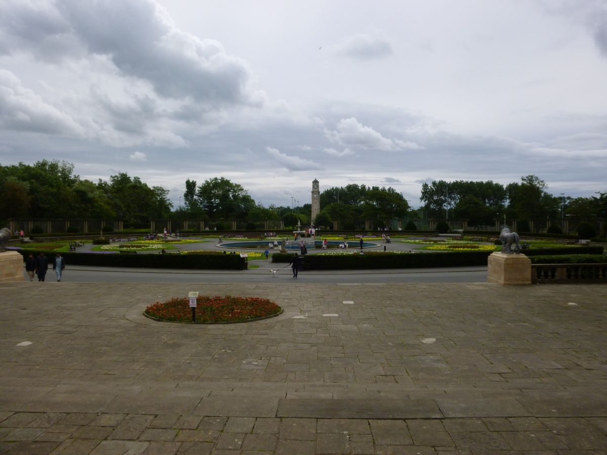 At the centre of the park the cafe faces south onto a terrace with formal beds. A grand flight of stone steps leads southwards down to a lower terrace, which has semicircular seating areas on each side; the stair continues down and terminates with stone piers surmounted by statues of lions which were the gift of the Chairman of the Park Committee in 1926. The steps lead into a formal garden called the Italian Gardens. This consists of a circular area with paths radiating from it. Around the edges a sense of enclosure is created by the use of curved linear pergolas consisting of paired Tuscan columns. Paths lead to the centre between geometrical beds and a central marble fountain. The arrangement of the Italian Gardens accords in almost every detail with the plan Mawson published in 1922.