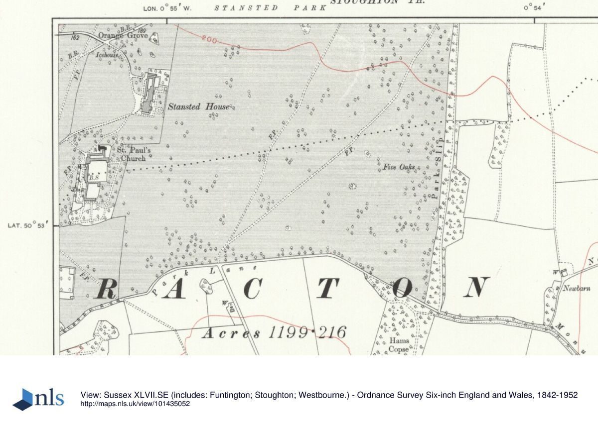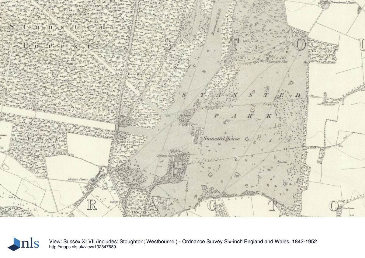 Stansted probably originated as a park within the Royal Forest of Bere Porchester, whose over-lords were the earls of Arundel. It was recorded as in use for hunting and for timber production in the medieval period, while a survey of buildings of the Manor of Stansted in 1327 included a hall and a chapel. On the death of Jane, daughter of the last Fitzalan earl, in 1576, and then of her husband, John Lumley, in 1609, Stansted passed to his cousin Sir Richard Lumley. In 1686 his son Richard, second Viscount Lumley, later created first Earl of Scarborough, began building a new house on the site of the present one and laying out formal gardens, radiating avenues and parkland on its east side. He probably also cut the central avenue through Stansted Forest to the west. The second Earl inherited in 1721 after which the estate passed to his younger brother who died in debt in 1766, leaving Stansted to his nephew, George Montague-Dunk, second Earl of Halifax. He built two follies, one of which was the Racton Tower (outside the registered site), and added to the planting in the park, the landscape of which was praised by Horace Walpole in his essay On Modern Gardening in 1785. The estate was sold in 1781 to Richard Barwell, who commissioned Lancelot Brown (1716-83) that year to visit and prepare proposals for the house and grounds although there is no further evidence of his having executed landscape improvements. Barwell died in 1804 and the estate was sold to Lewis Way. He replanted the entire estate, including the Forest (although retaining most of the rides), laid out new, informal drives to the house and probably rebuilt the kitchen gardens. In 1826, the estate was bought by Charles Dixon who significantly altered the house. On Dixon's death in 1855 Stansted passed to his widow and then to her grandson George Wilder who, with his son who succeeded him in 1896, continued the development of the gardens around the house and the chapel. Following its destruction by fire in 1900, Stansted was rebuilt in 1902 and sold by the Wilder family to Major Cecil Whitaker who sold on in 1924 to the ninth Earl of Bessborough. In 1983, the tenth Earl transferred the house and estate to the Stansted Park Foundation, which now (1998) owns and manages them as a charitable trust.