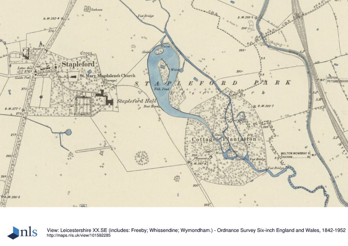 Three hundred metres east of the Hall the River Eye has been dammed to form a 300m long oval lake with serpentine tail to the south, in the centre of which is a large wooded island. The serpentine tail extends into the Cottage Plantation, circular, 400m in diameter, and with woodland walks. This was planted between 1818 and 1824. The landscaping of the 1770s and later also included the planting of clumps; a cohesive circular example survives 300m south-east of the Hall, together with less compact examples and large numbers of mature, individual trees, mostly oak. Further planting took place after the Grettons purchased Stapleford in the 1890s, and the many small clumps of oak, Turkey oak, beech, lime and red horse chestnut date from this time.