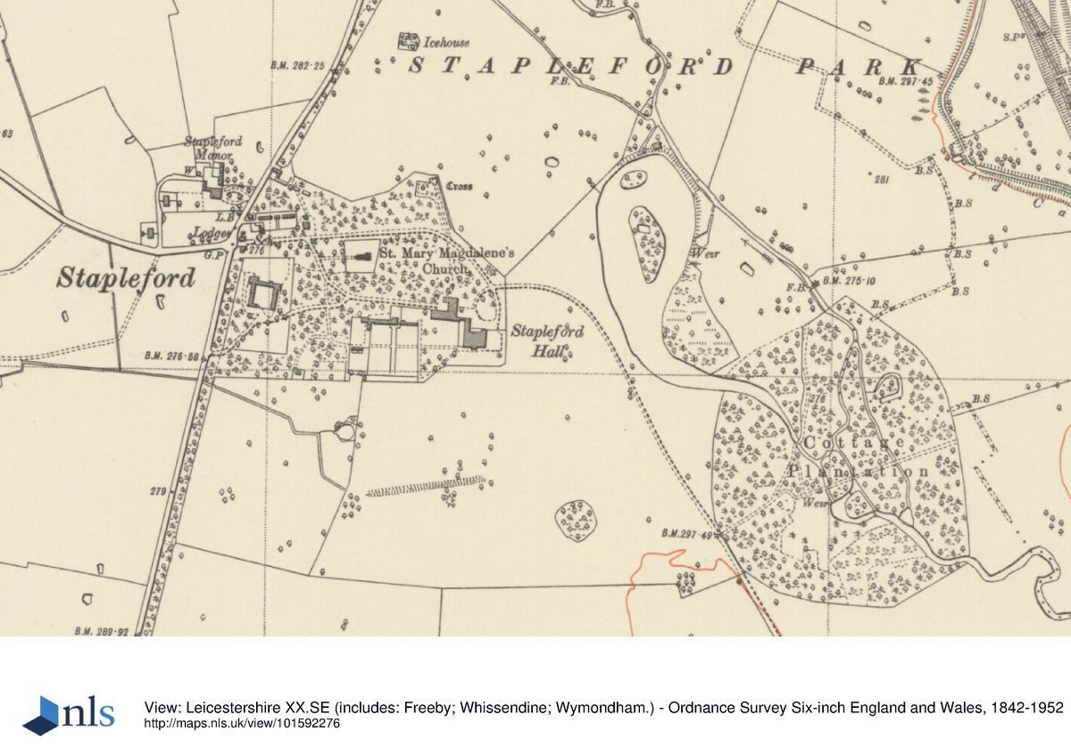 Stapleford Hall stands within its park 5km east of Melton Mowbray. Although there is no longer a village at Stapleford the Hall is used as a hotel and various estate cottages for staff accommodation, while St Mary Magdalene?s church stands within the grounds. Minor local roads run around the west and south sides of the park, the third, easterly, boundary following the railway. The park is crossed from south-east to north-west by the River Eye, the shallow valley of which is overlooked from the Hall to the west, which also has views south over gently falling ground. The area here registered is c 300ha.
