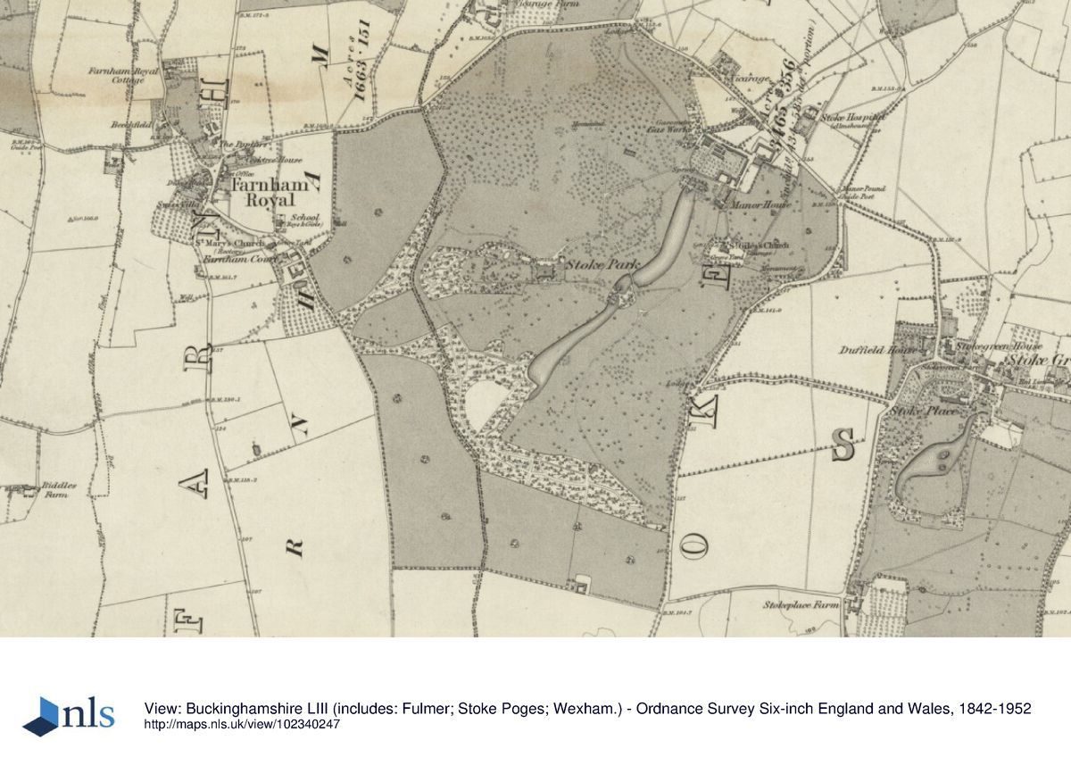 Stoke Park lies at the south-west end of the village of Stoke Poges, adjacent to the 1930s' Stoke Poges Gardens of Remembrance, 3km north-east of the centre of Slough at the southern extremity of Buckinghamshire. The c 115ha park is bounded largely by C20 suburban housing, and partly by roads marking the former north and east boundaries: Park Road and Church Lane respectively. The land is gently undulating, with a valley running north to south through the western edge of the park; a second valley runs north-east to south-west across the eastern half of the park. The setting, once rural, is now largely suburban, with the substantial housing estate of Manor Park lying adjacent to the south. Long views extend south from the house and the southern edge of the pleasure grounds towards the River Thames and Windsor Castle (qv). Stoke Park is part of a group of landscape parks around Stoke Poges, including Stoke Place, Wexham Park and Stoke Court.