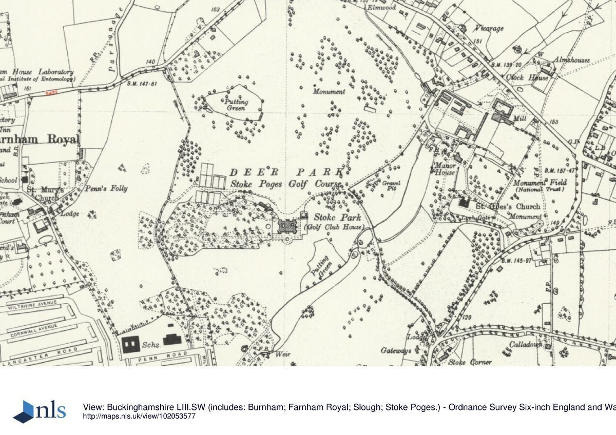 The Penn family sold the estate in 1848, it subsequently passing through the hands of several owners during the later C19 and early C20. A golf course was laid out by H S Colt in 1908, and in 1911 parts of the park were sold for housing. From 1920 to 1958 the golf club was owned by Sir Noel Mobbs, who extended the golf course and in the 1930s laid out the Stoke Poges Gardens of Remembrance (qv) on part of the eastern parkland, south of the church. The house is now (1998) a hotel and country club, surrounded by the golf course.