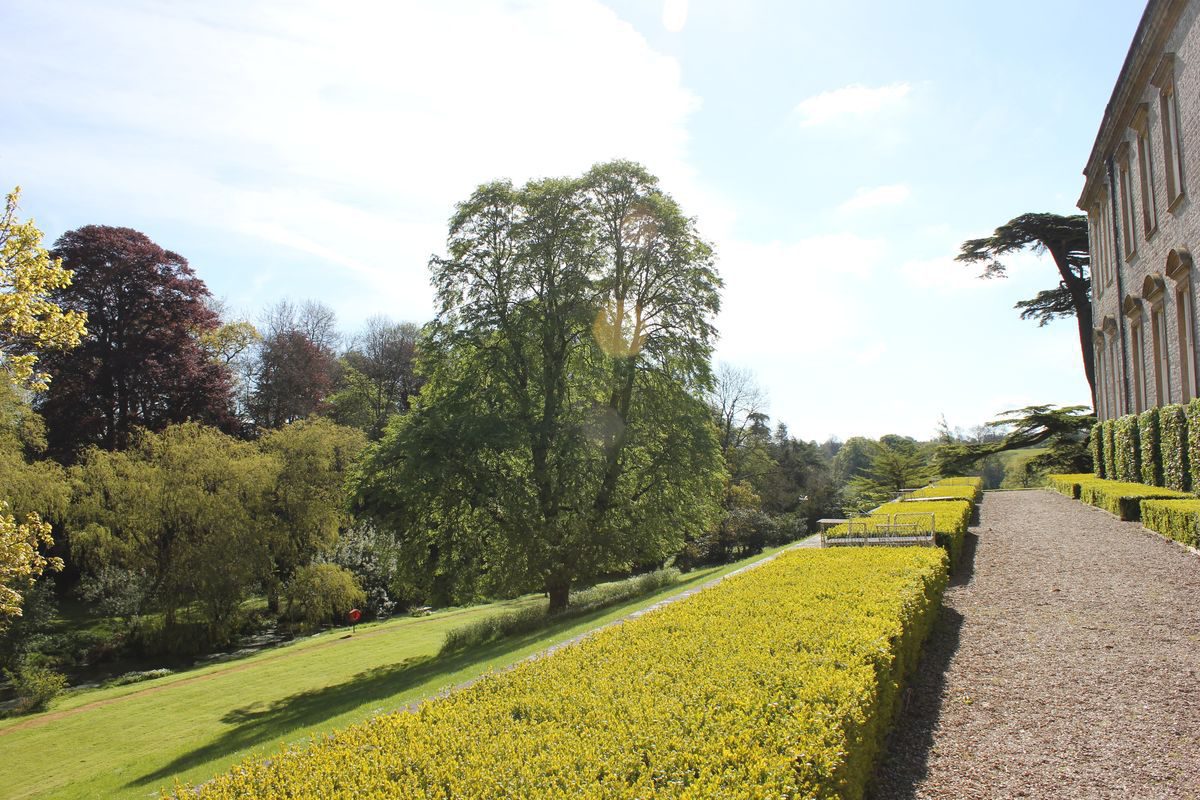 A paved terrace retained by a low stone wall ornamented with urns and edged by a low box hedge extends below the north façade of the house. Below the terrace, a north-facing grass slope drops to a stream which is artificially widened and enlivened by a series of shallow cascades. The grass bank is planted with mature specimen trees which help to frame northern and eastern vistas from the terrace. Beyond the stream a level area of lawn is backed by a mixed plantation on the south-facing valley side.