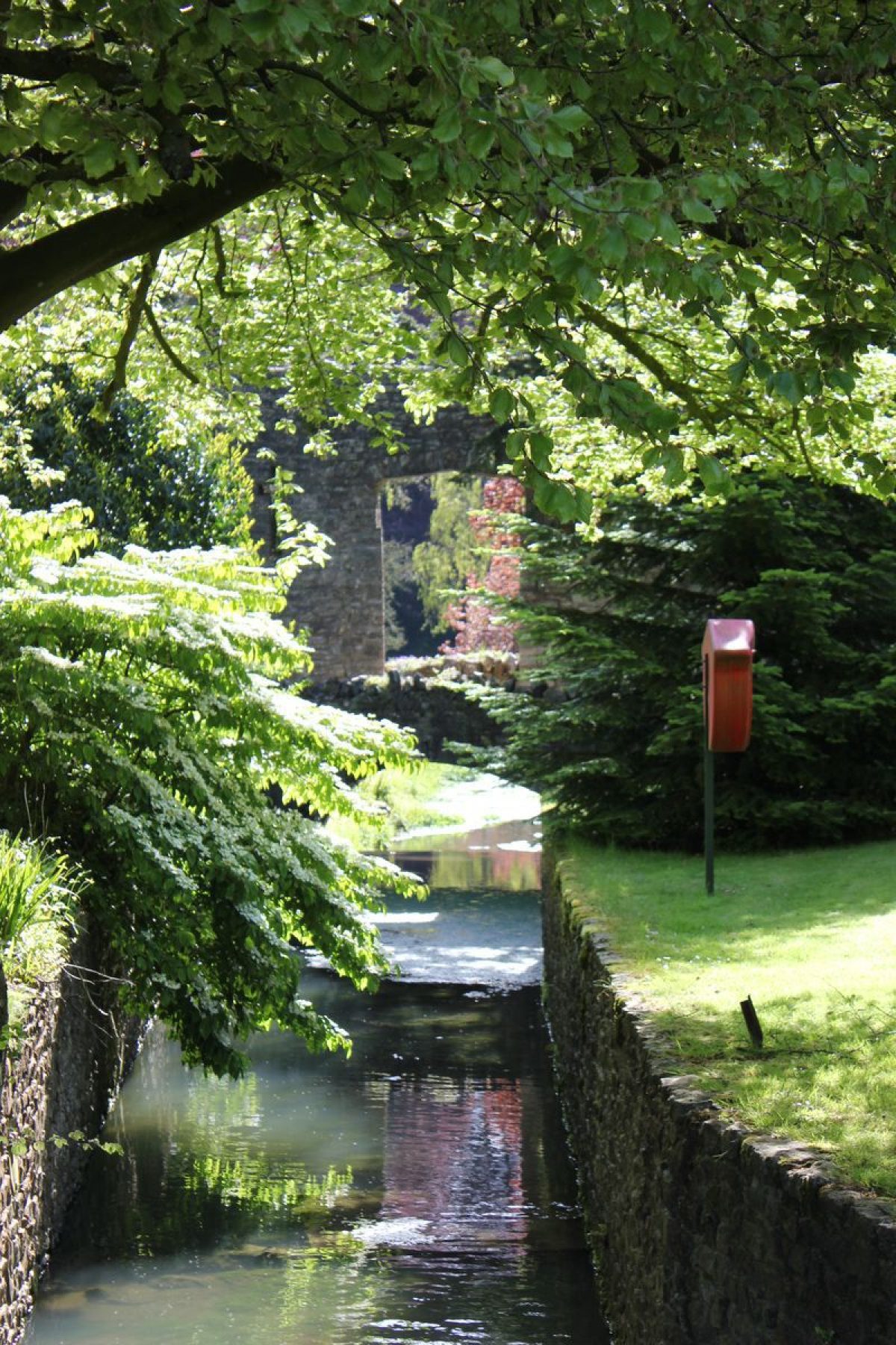 A gravel walk leads north-west from the terrace and drops gently north through a belt of mature yews and specimen trees which serves to screen the stables and kitchen garden to the north-west of the pleasure grounds. The walk crosses the stream on a stone bridge comprising a single perpendicular-gothic arch which spans a cascade. To the north-west the bridge incorporates a screen wall c 3.5m high in the form of a pair of gothic turrets, a central perpendicular-gothic opening, and flanking walls (all listed grade II). The wall serves to screen the kitchen garden from the pleasure grounds, while the central opening allows a view into the garden from the bridge and affords an open view when seen from the eastern end of the pleasure grounds. The bridge and screen wall appear to be of late C18 or early C19 construction, but while the cascade formed part of Repton's scheme of improvements, the bridge and wall are not described in his Red Book (1793).