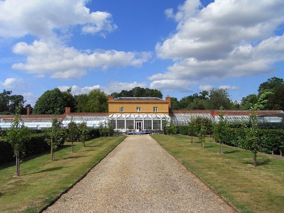 The kitchen garden stands c 200m north of the house, on the north side of Ice House Paddock. Laid out in the mid to late C18 to a tapered square in plan, it is enclosed by high red-brick walls and divided into two compartments, each with a central circular water tank, by an east to west wall (walls listed grade II). From an arched entrance in the southern wall, a central axial path runs north through the southern compartment, which is laid to grass, into the northern one which is quartered by paths lined with espaliered fruit and cultivated for fruit and vegetables. The axial path terminates at a glazed Camellia House, said to be designed by Joseph Paxton (guidebook), which is built as an ensemble with a two-storey gardener's house (listed grade II) into the north wall of the garden. Northwards, paddocks and private gardens occupy the site of a former orchard shown on the OS map of 1870.