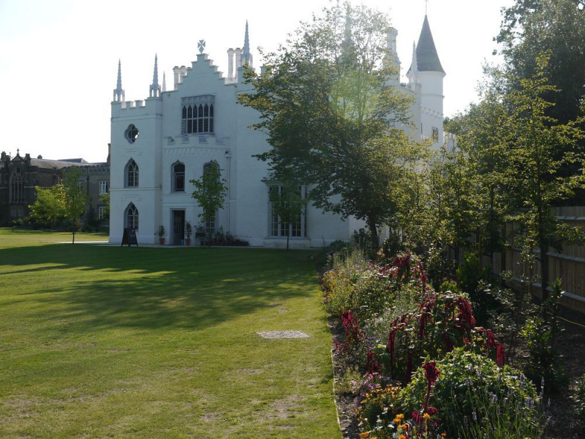 Strawberry Hill (listed grade I) was built between 1749 and 1776 by Horace Walpole who, with William Robinson and James Essex as executive architects, converted and extended Chopp'd Straw Hall, built in 1692, into his famous 'Gothick Castle'. Some of the interiors were designed by Richard Bentley, John Chute, Thomas Pitt, and Robert Adam. Walpole's aim was to create a house that was a cross between a medieval castle and an abbey. The chief facades are to the east and provided Walpole with 'an animated view of the country and moving pictures, a gay variety of the scene with out, which is very different from every side, and almost from every chamber' (ibid). The extensions to the south, which encase the base of Walpole's circular tower (1759), are the C19 additions added by Lady Waldegrave.