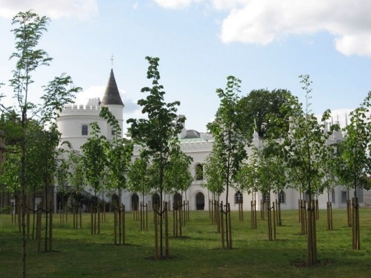 The Strawberry Hill Trust is in the process of restoring an 18th-century landscape garden, originally designed for Horace Walpole as a setting for his 'Gothic Castle' at Strawberry Hill. At its most extensive the garden occupied about 18 hectares. The views have been lost to housing and the growth of woodland but the grassed areas and the layout of his tree planting survive. The garden is as far as possible being restored to its original appearance. Walpole's extraordinary Shell Bench has been recreated. His Grove of lime trees is being replanted, as he wrote to his friend Horace Mann in 1753: “it is an open grove through which you see a field which is bounded by a serpentine wood of all kind of trees and flowering shrubs and flowers”.