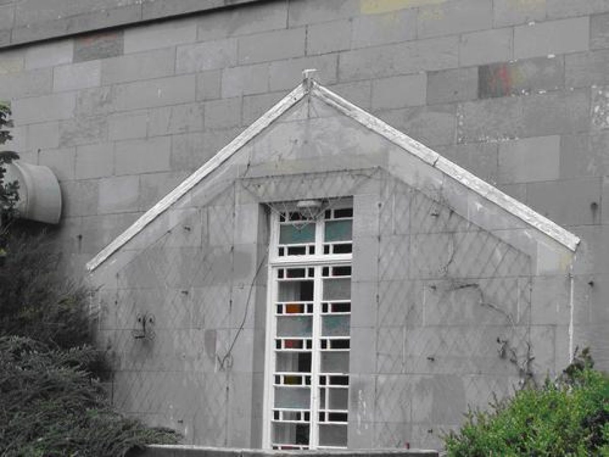 The area to the south-west of the site includes some specimen trees and due west of the house (aerial photo of 1970 Stainforth History Society book) shows four parterres with cross paths with sundial or feature at axis of paths. No traces remain of these. There is now also an unsightly telegraph pole. There were double doors with coloured glass which lead into the conservatory on the west side of the house. Although the conservatory no longer exists, this glass may have been a frieze which went around the conservatory, as it was not unusual for a Victorian conservatory to have one. Also on the outside there are the remains of an ornate shape around the doorway which had a bee painted in a deep turquoise (a 1920s colour). Old vine eyes hold the wire (in a diamond pattern) away from the wall. There are also signs of supports for benches around what was the outer wall with planting spaces at each side of the ornate entrance. The remains for red/cream caustic tiles are on the floor. The remains of the base of the conservatory show it was built of stone, but was brick-lined and with a stone capping above.