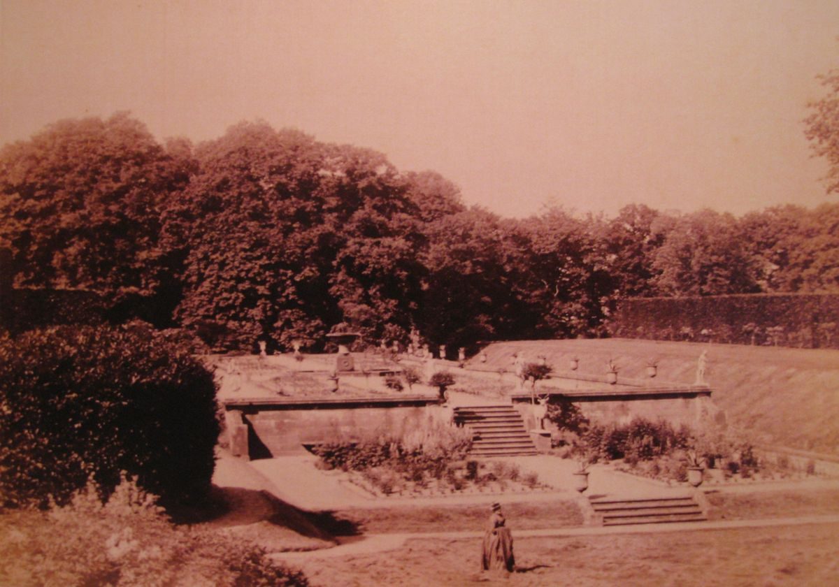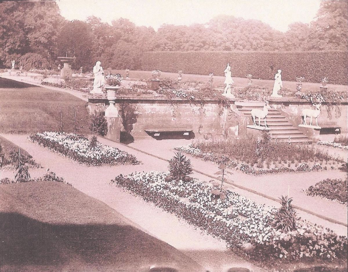 The Italian Garden, occupying a broad terrace close to an apparently artificial ravine, was a conspicuous feature. Its plan was simpler than many Italian gardens and it was planted with zonal Pelargoniums, amid large specimens of Rhus typhina which appeared to have been there for several years. There were high, clipped yew hedges. Most of the flowers needed for cutting were grown in the kitchen garden. Many herbaceous flowers were cultivated, eg early chrysanthemums and dahlias. Carnations and violets were grown, together with new varieties of violas and sixty varieties of sweet pea. In the numerous glass houses were grown decorative plants for the mansion and flowers for cutting, eg heliotrope, lilies, fuchsias, hydrangeas and pelargoniums. The fernery contained a collection of exotic ferns. Eucharis, Crotons, Marantas and palms were grown, as well as grapes, peaches and tomatoes.