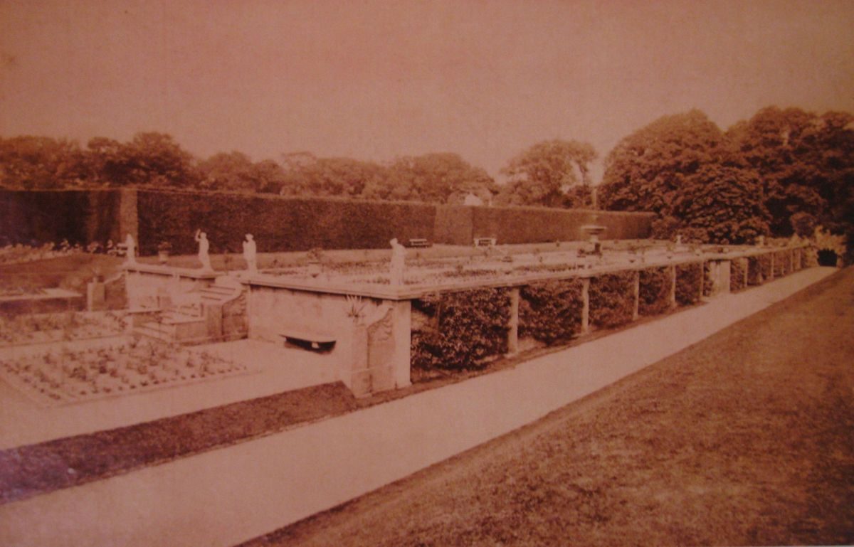 'To the West of the house are Italianate gardens, ornamented with statuary and large fountain in the centre. Adjoining are the vegetable and fruit gardens, divided into sections by splendid ten foot high yew, hornbeam and beech hedges and a high brick wall on two sides. To the North are the glass houses.