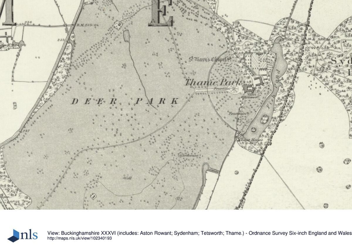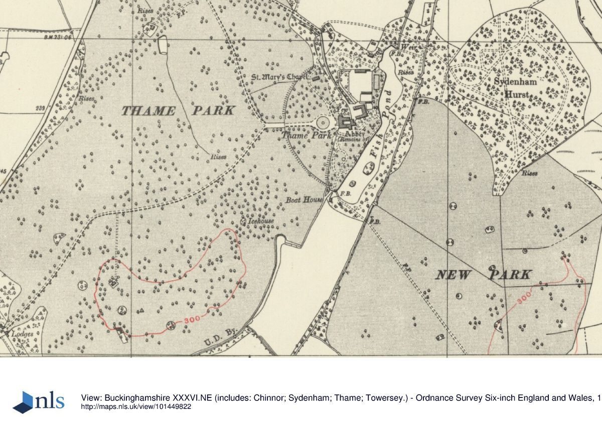 The new park, bounded to the north by Sydenham Hurst, a mixed woodland, is divided by several hedges, being mixed arable and pasture, retaining some mature single trees and clumps. It enjoys views east and south towards the Chiltern scarp, but is largely screened from the house and pleasure grounds by the belt of trees east of the pond. Late C19/early C20 mapping shows progressive planting of single trees and clumps, in addition to a few already existing small clumps, and the initial labelling of the New Park in 1901 (OS).