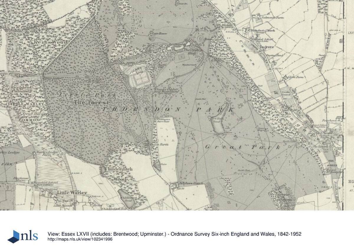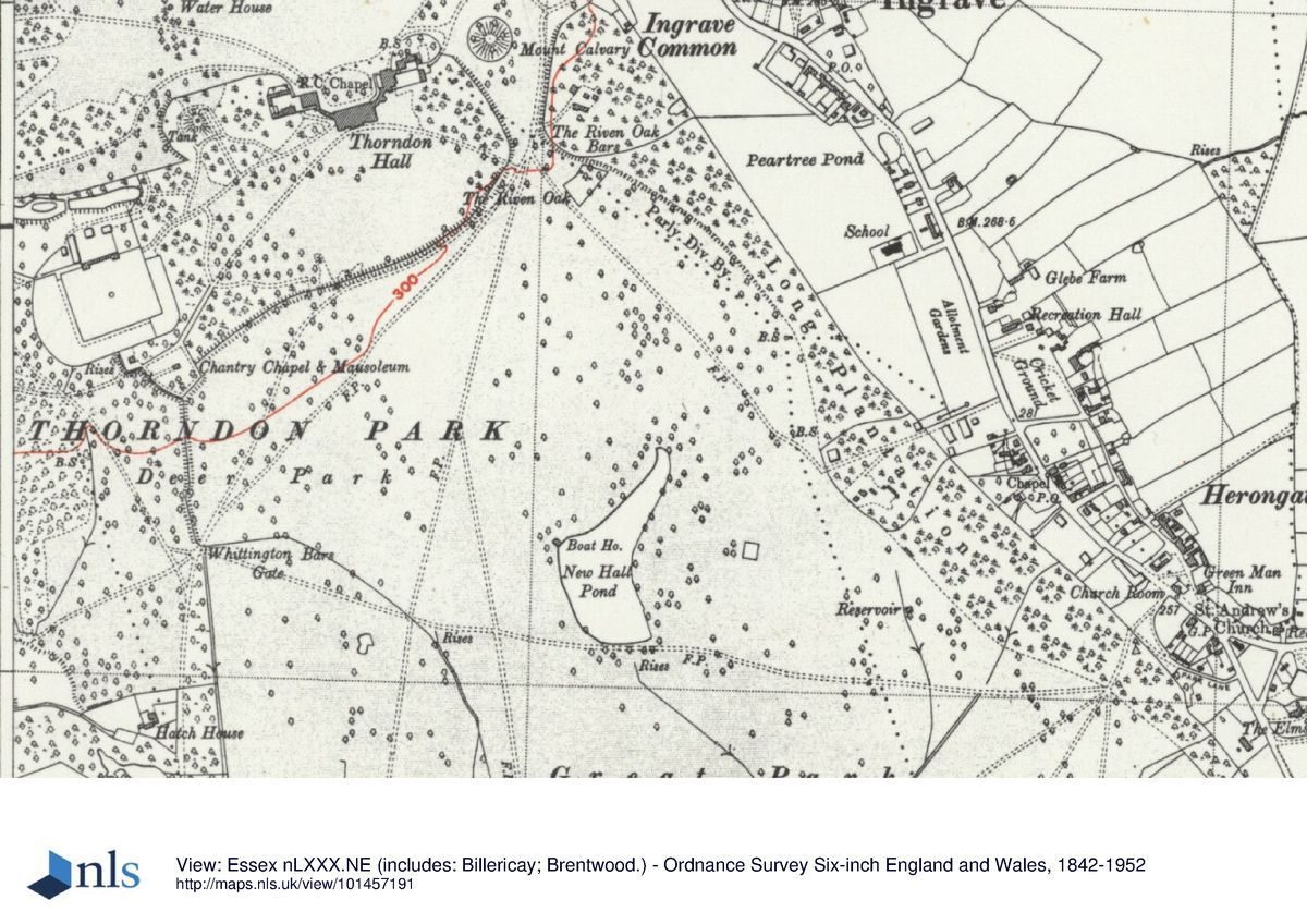 The park surrounding Thorndon Hall, which sits in the north-east corner of the site, is extensive and contains remnants of the early C18 layout, together with features of Lancelot Brown's work, all partly overlaid by C20 developments. To the north of the Hall, an area of open parkland which survived as a softened form of the early C18 formal landscape until at least 1805 (Clayton map) has, during the C20, been developed as a golf course, now planted with ribbon strips of trees. To the west of the Hall lies the extensive mixed woodland known as The Forest, which now (2000) contains the country park visitors' centre. Also within this dense woodland lies the walled kitchen garden (see below) and the private Petre family Roman Catholic Chantry Chapel and Mausoleum (listed grade II), built of ragstone under a red clay tiled roof in the Gothic style in c 1850.