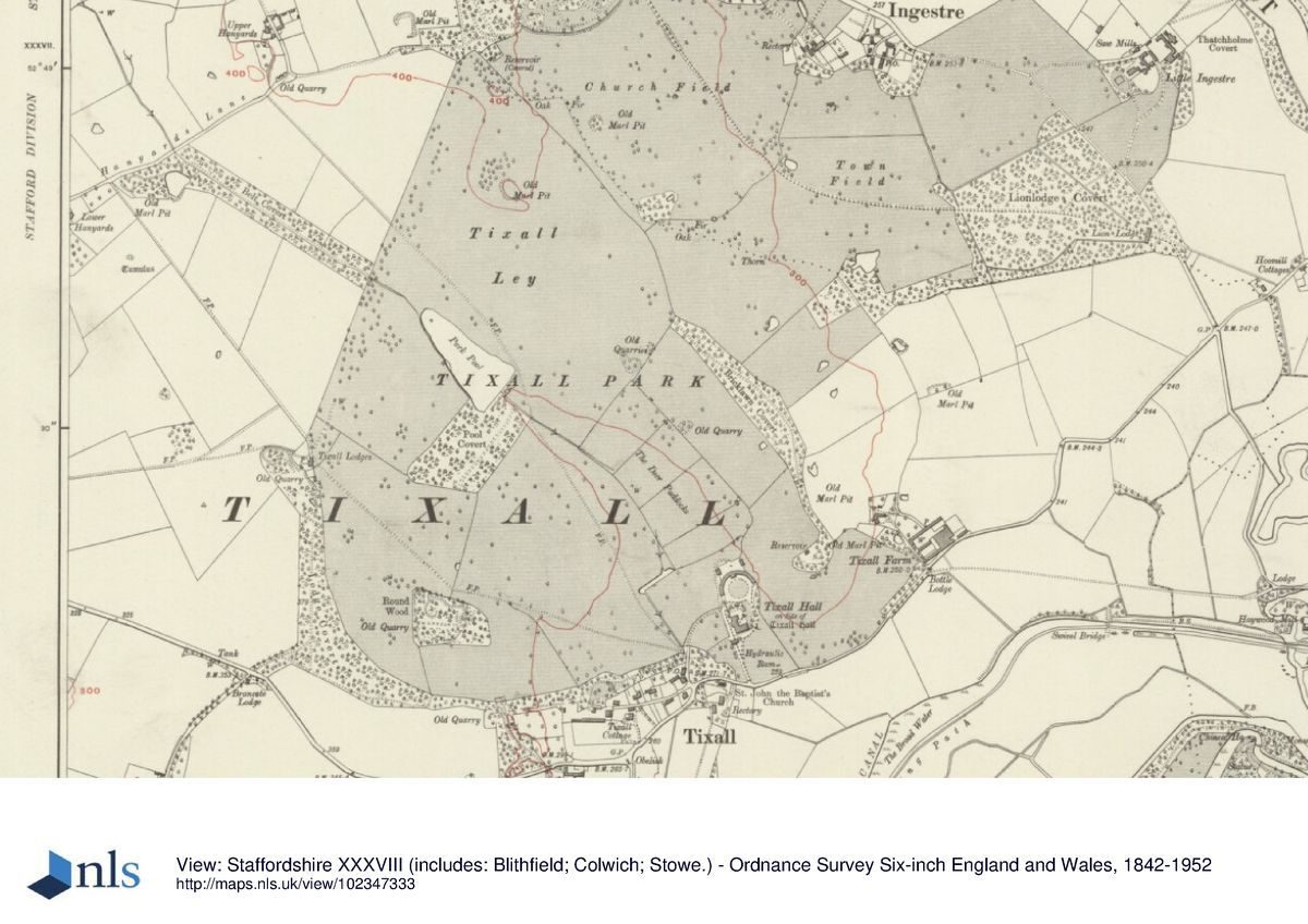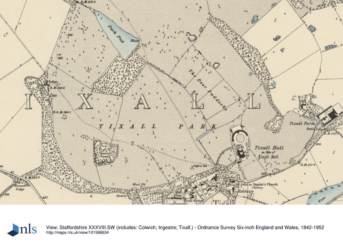 The vista towards the Trent and Mersey canal was improved by William Emes, who had the canal widened to give the impression of a lake known as the Tixall Broad. The house was demolished, leaving a semi-circular stable block. The stables were converted in the late-20th century to houses, and the Brown landscape was ploughed out.