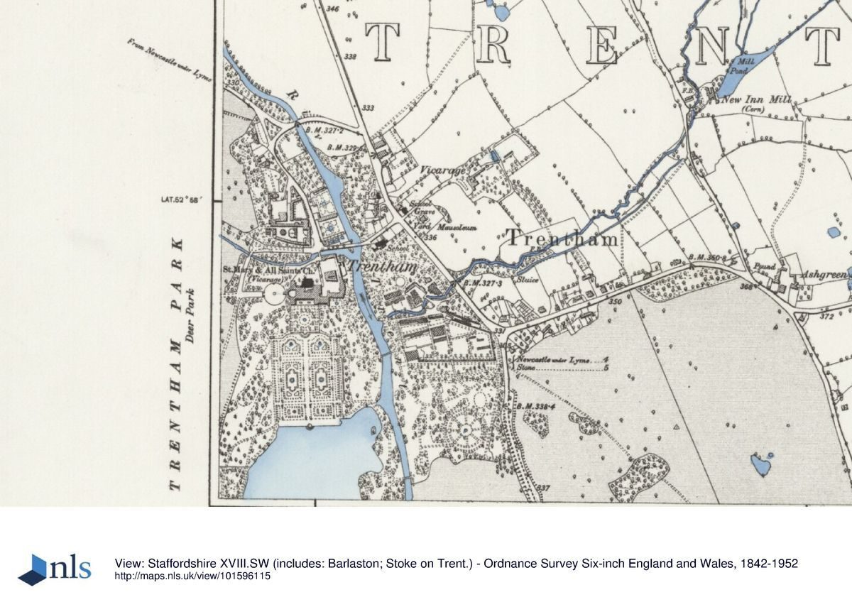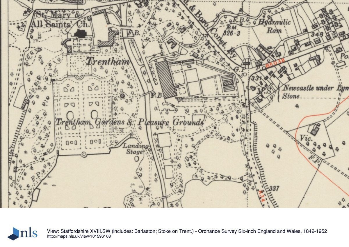 Trentham Gardens and Pleasure Grounds lie west of Trentham village, on the southern fringe of Newcastle-under-Lyme. Running north/south down the east side of the Gardens is the River Trent. To the east the park is bounded by the A34, to the north by the minor Whitmore Road, while to the west the park abuts the M6 motorway. The southern boundary of the park follows field edges north of Beech Lane. The registered area is c 450ha.