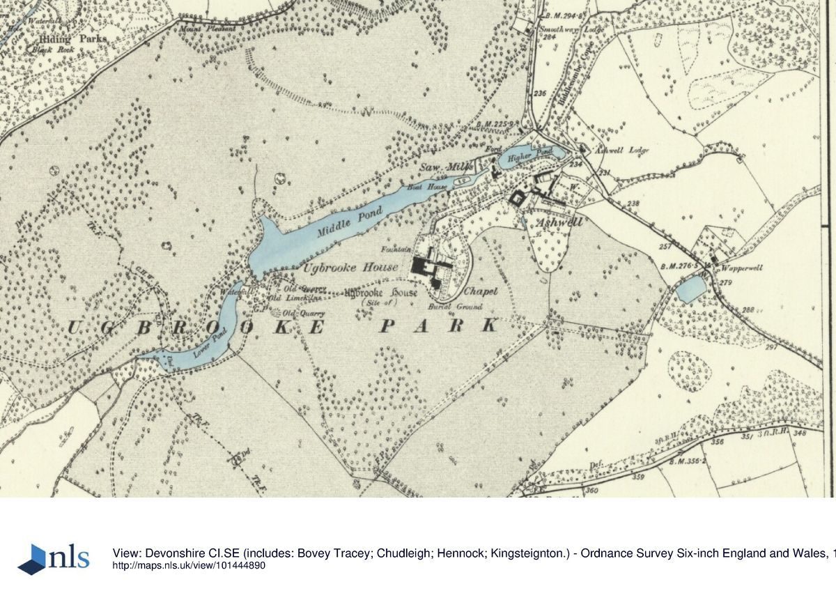 To the north-west of the park, beyond the late C18 road from Gappah to Biddlecombe and outside the park wall, Riding Parks, an area of woodland on a north- and north-west-facing slope above the Kate Brook was developed with a series of rides and walks in the late C18 or early C19 to take advantage of views to the picturesque Chudleigh Rocks and remains of the medieval Bishop's Palace. Riding Parks was connected to the drives within the park by a gateway at Mount Pleasant c 800m north-west of the House. To the south-west, Lawelldown Wood forms an extension of Riding Parks on the hillside above the late C18 landscaped grounds of Lawell House, which by that period was used as the Dower House. Bounded to the west by the minor road from Gappah to Chudleigh, the grounds of Lawell House comprise areas of lawn and shrubbery, with meadows and woodland to the north-east and south-west. The picturesque Lawell Drive extends from Ugbrooke Park, under the late C18 road from Gappah to Biddlecombe and thence north-west through Lawelldown Wood c 400m to Lawell House and on for some further 400m to join the main road which runs north-east to Chudleigh at a point c 2km west of Ugbrooke Park. This drive formed part of Lancelot Brown's late C18 scheme for Ugbrooke.