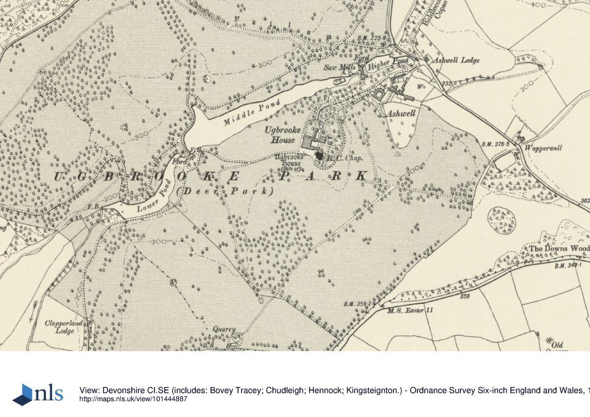 Ugbrooke Park lies in the upper valley of the Ugbrooke, a stream which flows from north-east to west-south-west through the park. The ground rises to high points to the north at Castle Dyke Camp, and to the south-west.The following is from the Register of Parks and Gardens of Special Historic Interest. For the most up-to-date Register entry, please visit The National Heritage List for England (NHLE):