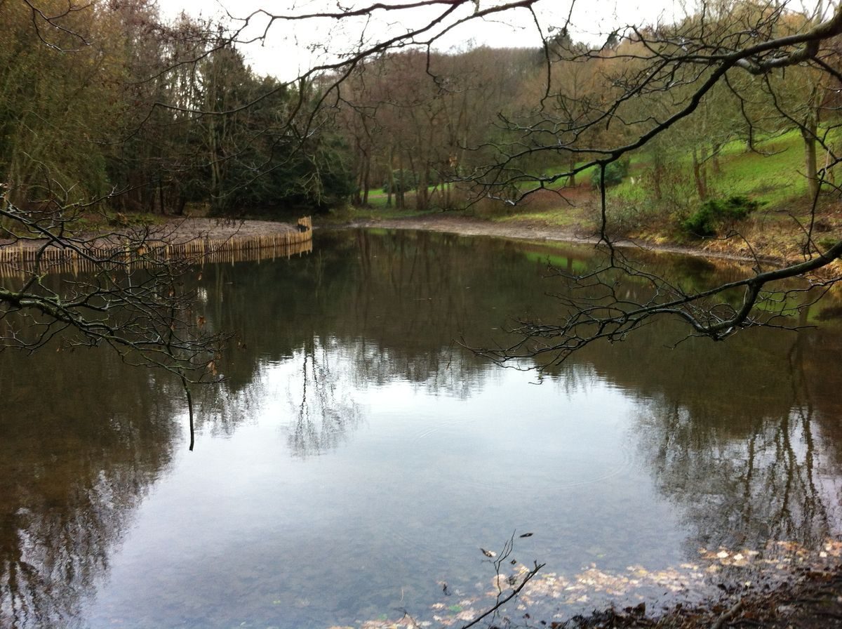 The triangular-shaped Middle Pond, 0.5ha when full, is currently (2011) being restored, temporarily reducing the area of water to c0.2ha. At the southern end of the pond, a former island (clearly shown on the 1857 estate map), planted with several veteran yew trees, is now (2011) almost surrounded by dry land. The pond is bordered to the west by a broad, grassy path, and managed woodland. On the eastern side, dredging has created a mound of clay c30m x 50m, fenced off from the pond. On the north-eastern and north-western sides, restoration work has exposed stone-built platforms, possibly the sites of former boat moorings. The platform on the north-western side is close to where a Victorian boathouse was once located (archive photograph). The very north-eastern end of the pond (cleared of bulrushes in 2011) is partly dry, exposing a stone head wall and dam, part of a stone pond lining, and a stone-framed sluiceway. Immediately behind the sluiceway, and built into a woodland bank, lies a rocky outcrop c5m high, the site of a former cascade. Early maps show a distinct spout to the north-east corner of the lake, believed to have formed a leat (estate plans 1857 and 1874).