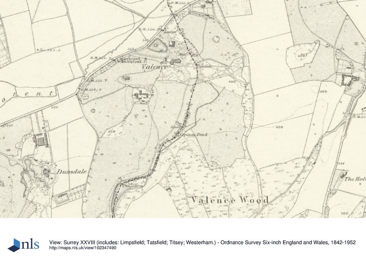 The irregular-shaped Neptune Pond, re-configured by Milner in the late C19 from pre-existing fishponds (last recorded on the Valence estate map of 1874) lies c160m south-east of the mansion and covers an area of 0.27ha. Bordered by alders, silver birch and aquatic plants, the pond is spanned at a narrow point in the middle by a brick built footbridge with iron railings (replacing the Victorian wooden rustic bridge - archive photograph), beyond which stands a tarmac seating area. To the north of the bridge the pond widens and encircles an island of alders with a small hut for wildlife. Approximately 10m east of the bridge, at the summit of a steep, overgrown woodland bank, stands a mid-C19, tunnel-shaped, red-brick ice house (first recorded on the estate plan of 1857) with a later wooden entrance door. The ice-house (in separate private ownership), extends into the bank for c10m and appears to have survived intact. About 10m north-east of the ice house lies a 0.14 ha, late C20 ornamental pond, also in separate private ownership.