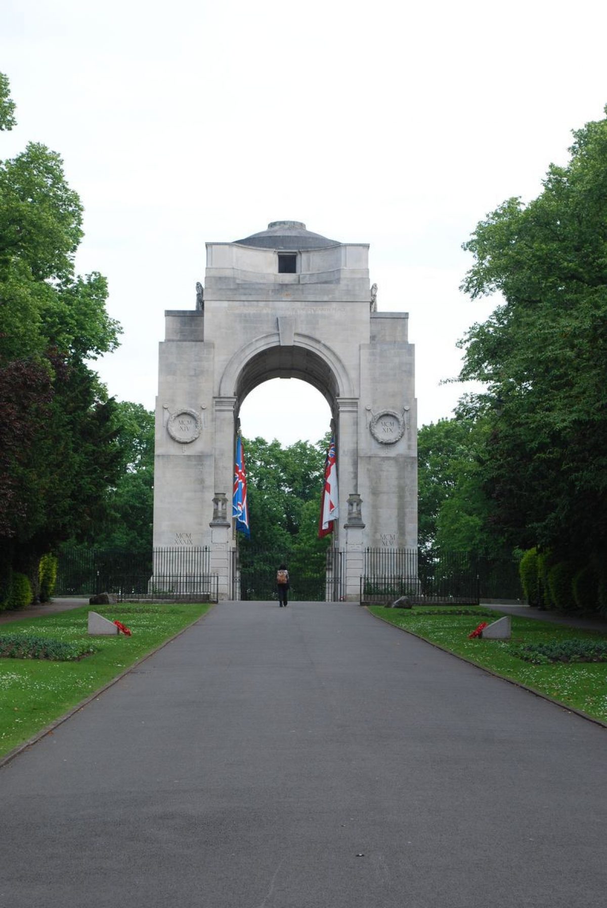 A second formal entry to the park is via the 150m long War Memorial Approach (renamed Peace Walk in the early 1980s), a tree-lined processional approach with massed bedding and shrubs, linking University Road with the War Memorial, which stands at its south-east end. On University Road are gates and screen (listed grade II*) of 1923 by Sir Edwin Lutyens, incorporating six Portland stone piers topped with urns and with an ornate overthrow incorporating Leicester's coat of arms.