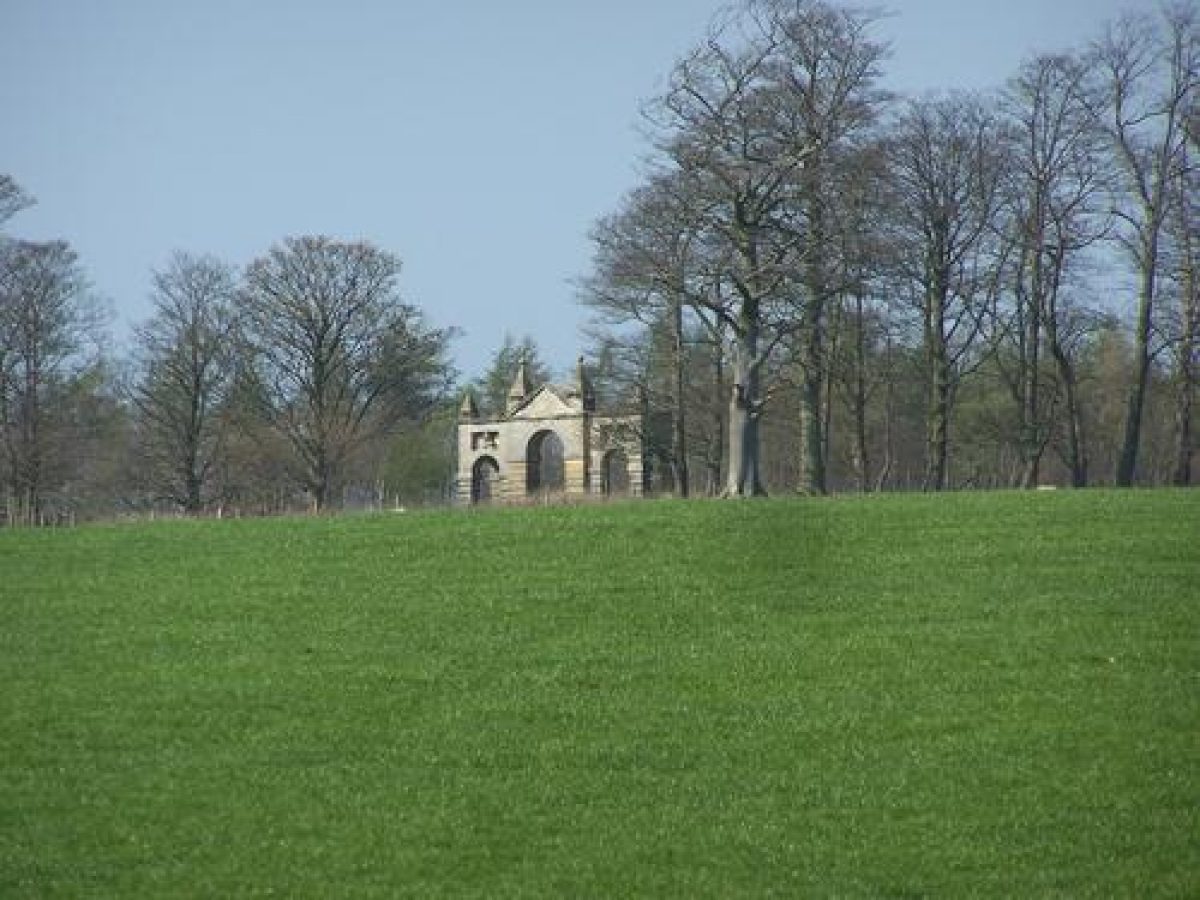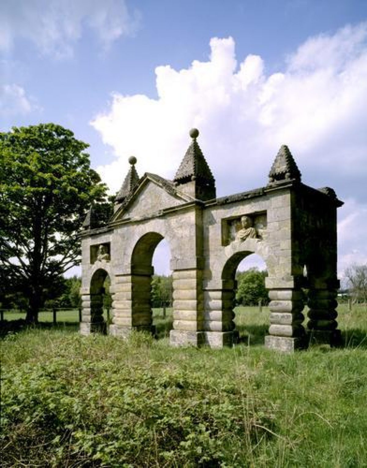- Description: The triumphal arch was originally in the centre of the stables. It was moved to a field in 1754 following the construction of the clock tower. It was turned into an eye catching folly which is visible from the gardens by the China Pond.