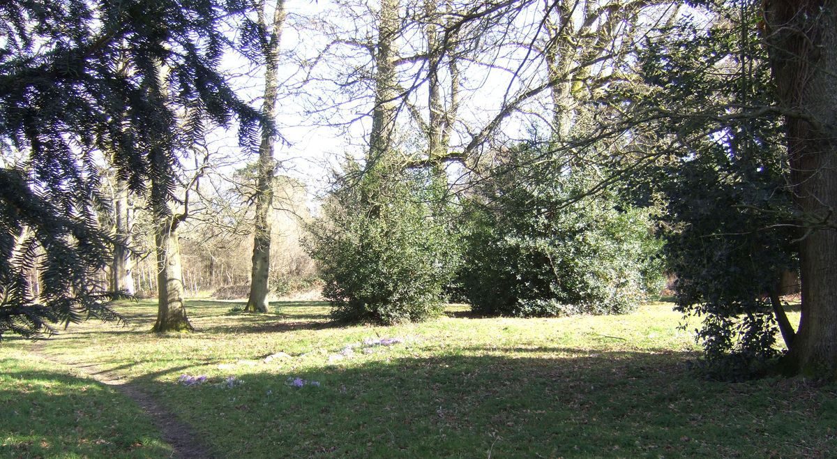 The small garden consisting of an oblong lawn is outlined by roses set in stone edged beds. These are within the arms of a magnificent stone walled and slated timber framed cloister adorned with bronze memorial plaques and a water fountain. To one side is a parkland with 100 year old oaks under-planted with hollies, and with crocus and narcissus scattered in the grass.