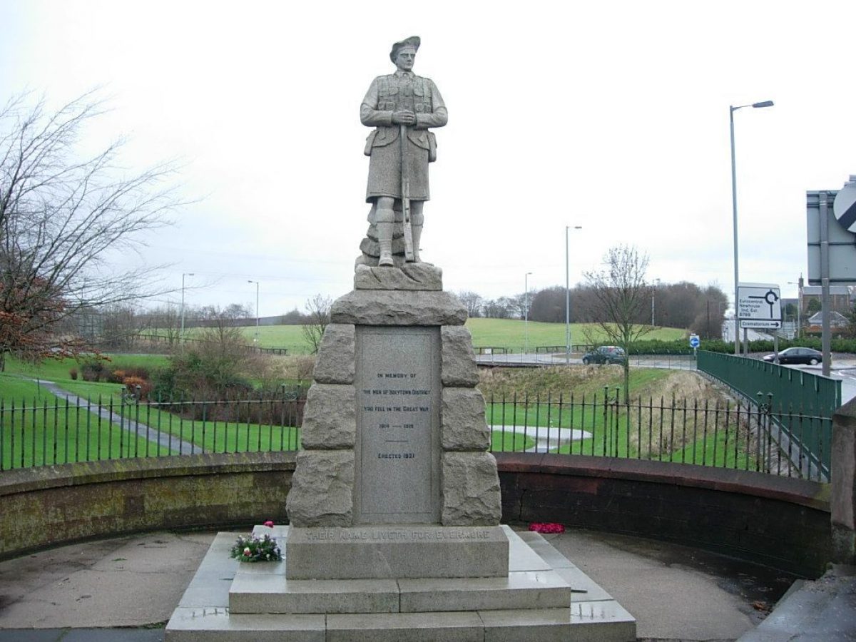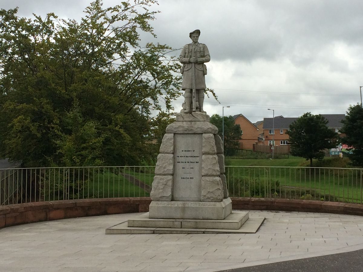 The Memorial Gardens in Holytown, North Lanarkshire include a War Memorial to commemorate the men of Holytown district who fell in the Great War 1914-18. The memorial consists of a kilted soldier on a tapering plinth and stepped base, constructed in Killemabreck granite by Glasgow firm Messer Scott & Rae sculptures and built by local building firm James Paterson and Son.