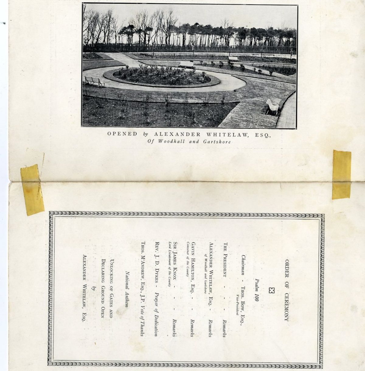The historic photograph reveals a pristine gardens, with neatly edged planting beds, and gravel surfaced paths set slightly below the grass verges. When first laid out visitors to the gardens could look beyond the burn to the Holytown church elevated on the adjacent ridgeline. The church's graveyard included the Whitelaw family mausoleum, and was linked to Woodhall Estate by a drive lined with beech trees.