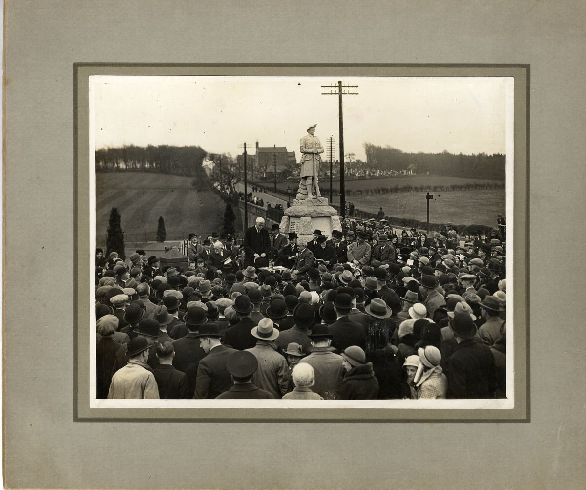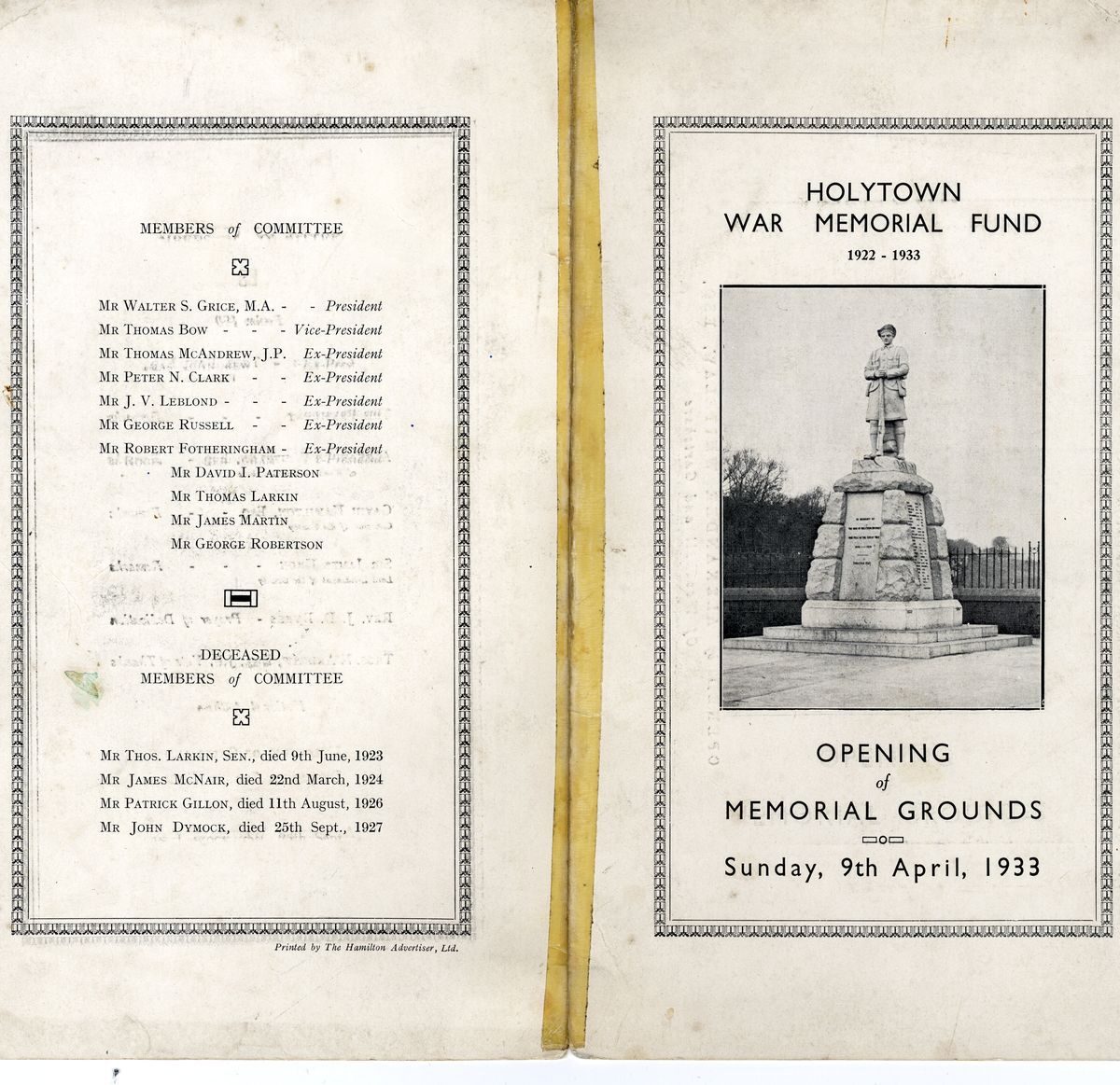 The Memorial Gardens in Holytown, North Lanarkshire which include a War Memorial to commemorate the men of Holytown district who fell in the Great War 1914-18 were opened at a ceremony which took place on Sunday 9th April 1933. The War Memorial and gardens were unveiled by Alexander Whitelaw Esq. from nearby Woodhall Estate. As was the case with many War Memorials at this time, the memorial was paid for by funds raised by public subscription, and the grounds on which the gardens laid out, were gifted by a local benefactor.