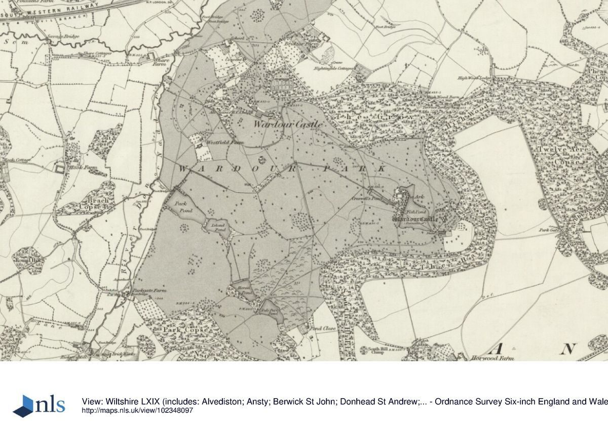 Wardour Castle, a site of c 342ha, is situated in a rural area c 8km south-west of Tisbury and immediately north-east of the village of Donhead St Andrew. The River Nadder forms the western boundary of the site, while the northern boundary is lined by Nightingale Lane. To the north-east, along High Wood, the boundary is formed by the remains of the park pale which enclosed the former deer park. To the south and south-east the building follows the edge of a series of plantations. North-west of the site runs the railway between Sherbome and Tisbury (along the River Sem), and to the south-east runs the A30 road. The site is mostly surrounded by agricultural land, with Bridzor Farm situated to its north, Park Gate Farm to the west, and Horwood Farm and Dairy to the south-east. The land at Wardour Castle is irregularly contoured, but generally slopes down from the east to the west and north-west and is lined with wooded hills to the north and east.