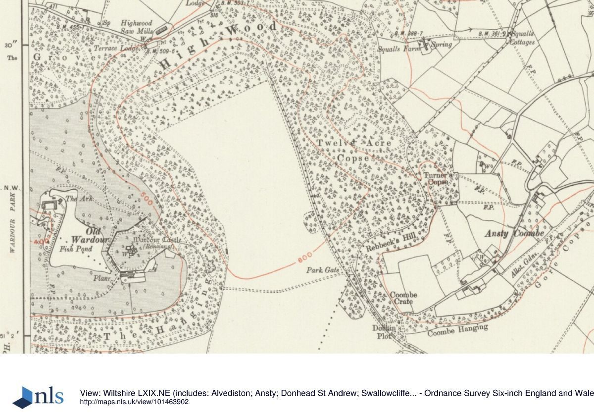 Old Wardour Castle (listed grade I), which stands c 1.2km south-east of Wardour Castle, was the main residence at Wardour until probably the mid C17 and stood in the north-east corner of an extensive deer park (Map of Wardour, ?C17). Some 70m south of Old Wardour Castle, outside the bailey wall, stands the C17 and C18 Old Wardour House (listed grade II), with a late C17 summerhouse to the rear (listed grade II). This building was probably built after Old Wardour Castle had become uninhabitable during the Civil War sieges of 1643 and 1644; it subsequently became the main family residence at Wardour and was probably used as such until the new Wardour Castle was completed in the 1770s.