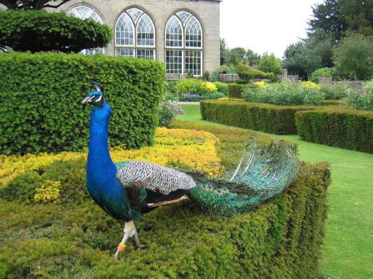 The site has an 18th-century park and river landscape around a medieval castle. The grounds occupy about 280 hectares. The gardens were largely remodeled in the 19th and 20th centuries, and feature the Peacock topiary garden, a Victorian rose garden, and a glasshouse.