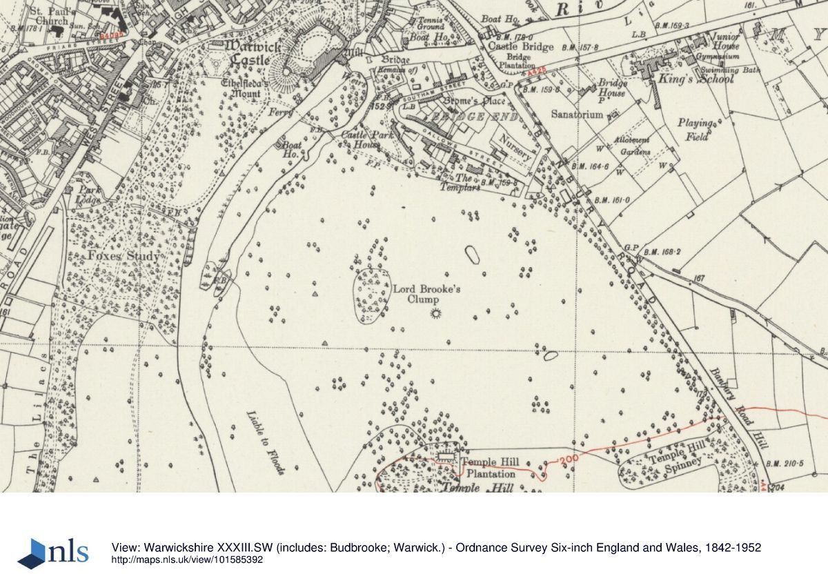 Castle Park extends south and south-east of the Castle, and lies principally to the east and south of the River Avon which flows through the park from north to south-west. The park is today (2000) in mixed agricultural use with level pasture planted with some scattered specimen trees surviving to the south of the Castle, to both east and west of the river. The park is enclosed to the east by a predominantly deciduous plantation which screens the Banbury Road which was diverted to its present course by the second Earl in 1782-7. To the south-east Nursery Wood is a late C18 mixed plantation on high ground, while a further late C18 boundary plantation screens the B4462 Barford Road which was constructed in 1772-92. Barford Wood bounds the park to the south on land added to the park after the Barford enclosure in 1760, and further plantations known as Ashbeds Wood and The Lilacs screen the western boundary; these plantations are shown on a plan of 1791 (WCRO). There are further plantations within the park, including c 450m south-east of the Castle Lord Brooke's Clump, and Leafield Privet c 1.3km south-south-west of the Castle. Temple Hill Plantation c 900m south-east of the Castle is today (2000) a mid C20 commercial coniferous plantation, while scattered mature specimen trees survive on the west-facing slope of Temple Hill overlooking the river.