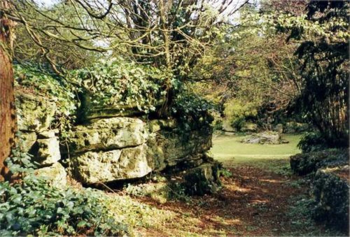 Leading at a right-angle off the gravel walk along the Upper Terrace, from the centre of the south front of the House, is the 150m long path which runs axially down the garden. Elaborate flights of steps carry the path down the several terraces, the path ending at a circular fountain pool with, on its south side, a large and ornate stone bench seat giving a view back up the path to the House. The view is framed by some of the largest trees in the south garden, notably a pair of cedars. Behind, and now largely screened by planting, is the ha-ha (listed grade II) which curves along the south edge of the garden. An iron estate gate and iron stile give access to the park.