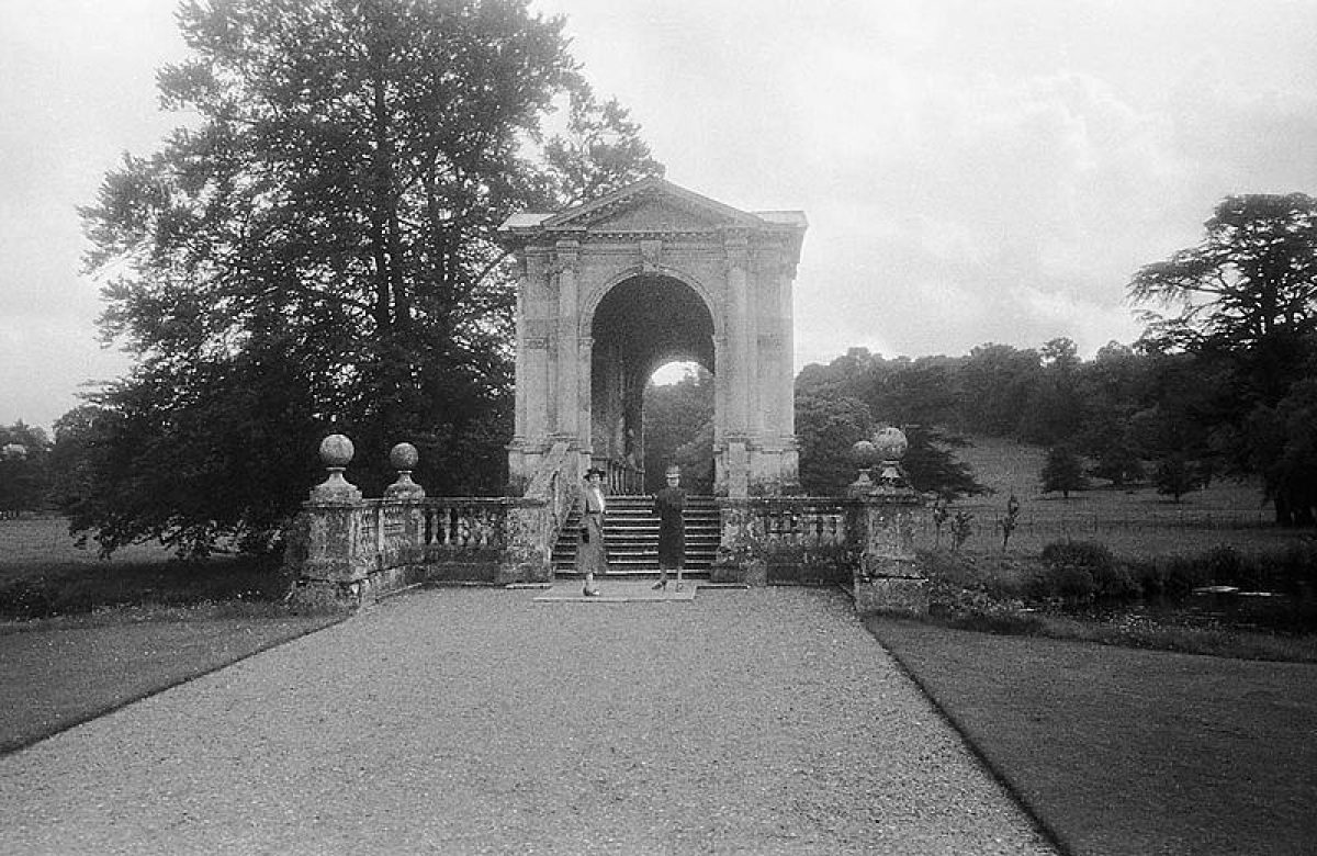 The gardens east of the House are enclosed to the north-east by the River Wylye and to the south by the River Nadder. The layout of this part of the gardens is characterised by a network of minor paths either side of a central walk. The latter starts from the east front of the House and runs c 300m eastwards into the more wooded part of the garden, to the early C19 Whispering Seat (listed grade II). Halfway along this walk stands a water feature by William Pye, introduced in 2001. Some 100m north-east of the House, adjacent to the forecourt, stands an early C19 semicircular stone garden seat. From here a formal walk, lined on either side by ten pairs of early C19 stone vases on pedestals (listed grade II), runs for c 200m southwards along the west front of the House to the River Nadder. Here it continues over the early C18 Palladian Bridge (listed grade I) and leads into the park south of the river. From the bridge there are fine views of the House to the north-west, and the gardens to the east along the north side of the River Nadder, and of the park south of the river. In the wooded part of the gardens, c 300m south-east of the House, stands the C18 three-arched Loggia. The latter stands on an axis with the Egyptian (C3 AD) Column of Venus Genetrix (listed grade I), c 25m to its south-west, and was re-erected here in 1895. Some 250m north-east of the House, surrounded by woodland, stands Park School House (listed grade I). This building probably dates from the C19 and incorporates part of a grotto by Isaac de Caus that was once part of the early C17 garden. A Japanese Water Garden, introduced c 1990, is laid out immediately south-east of the Whispering Seat, c 300m east of the House. A visitor centre with restaurant and adjacent car park (c 0.5ha) is situated immediately adjacent to the forecourt, c 100m north-north-east of the House, with a children's playground c 50m to the south-east (all late C20).