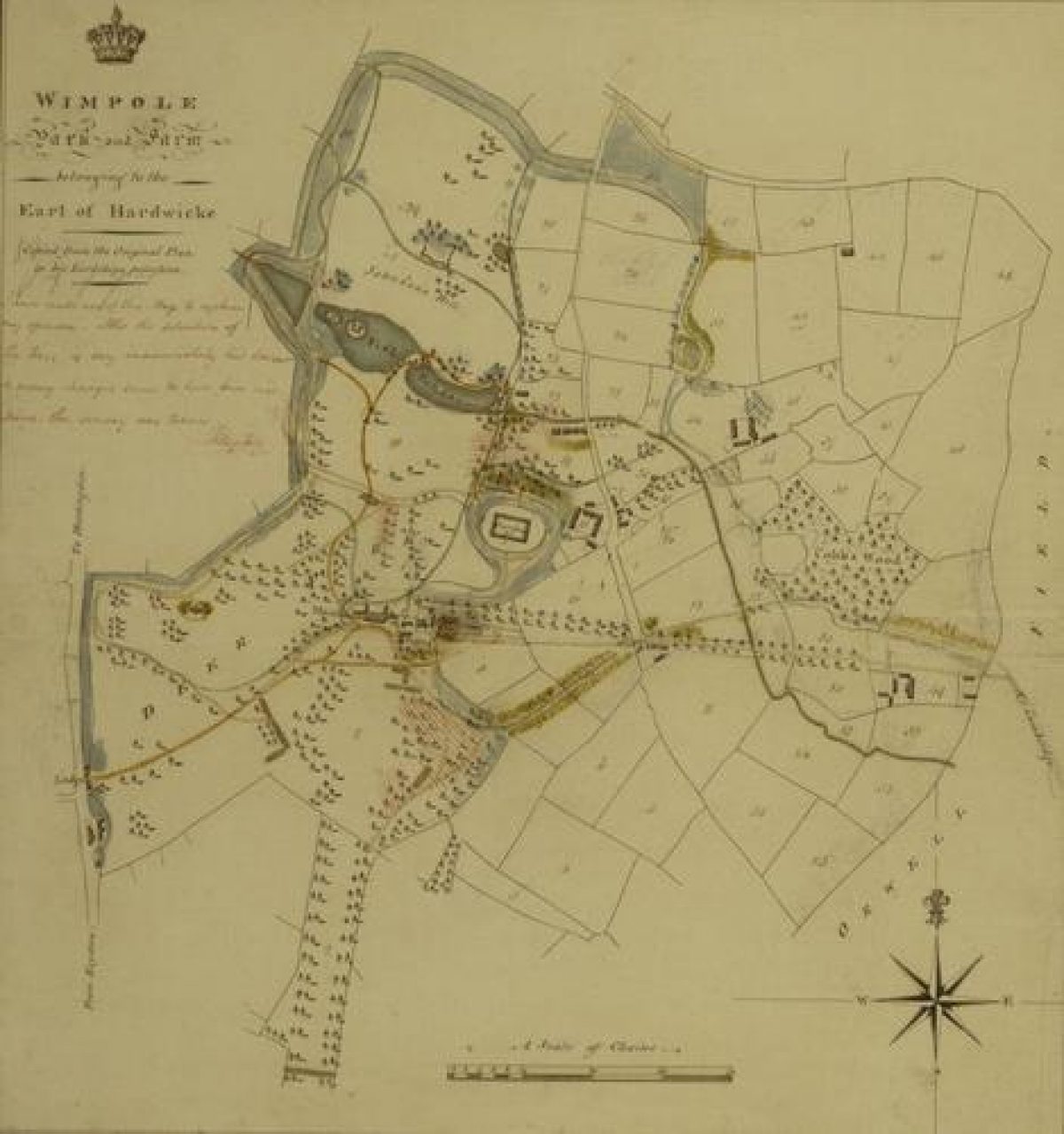 In 1740 Wimpole was purchased by Philip Yorke, the first Earl of Hardwicke and in about 1750 he asked Robert Greening (d 1759), a professional landscape designer to produce plans for altering the landscape. Greening began the process of removing the formal landscape, replacing straight walks and parterres with sweeping lawns and a pleasure garden near the Hall and softening the formal planting in the park.