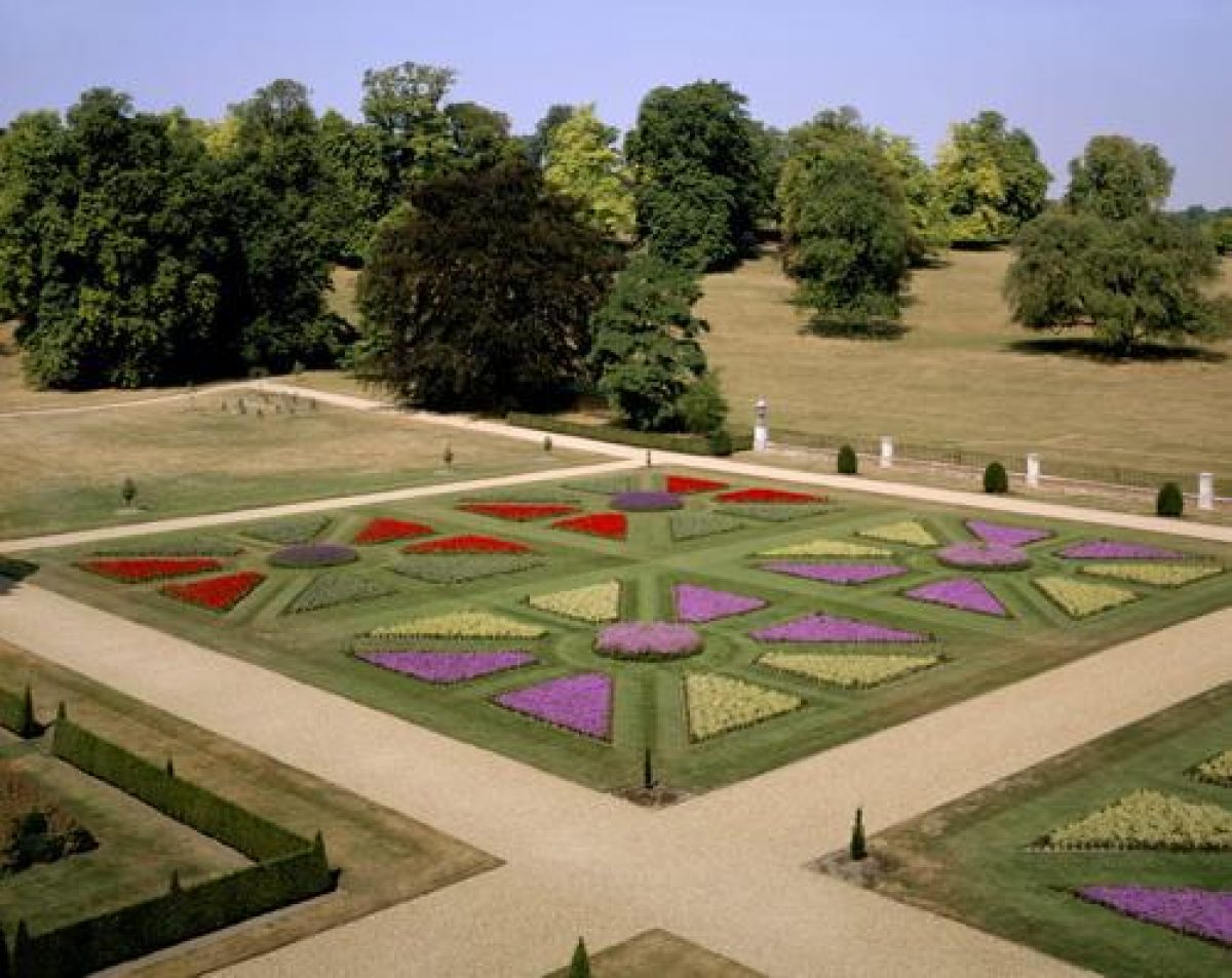 The Parterre is in a Union Jack pattern of triangular beds edged with thousands of box plants and is divided from the north parkland by a row of topiary yews. The area features a pair of giant stone vases which are carved with goats’ masks and the pipes of pan which date from the 19th century. There is a row of lead urns which sit along the boundary which are thought to date from the original garden plan.