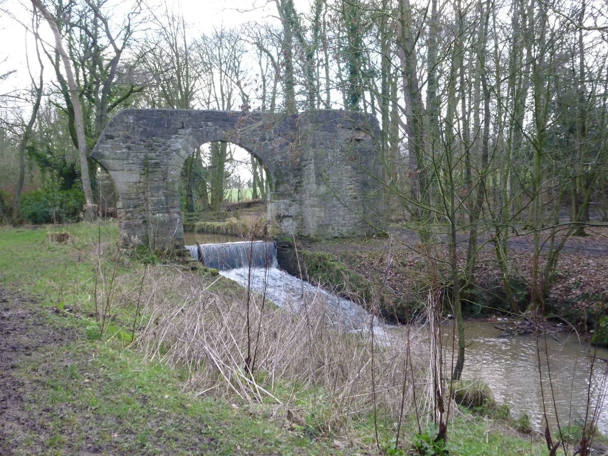 The path continues to the Shaw Brook and paths extend alongside the watercourse to the east and to the west. The Brook shows signs of having been modified at various times. Bridges of late C20 date cross it and there are weirs and masonry edging at various places along it. Footbridges and weirs are marked on the 1928 OS map which also shows the system of paths alongside the Brook. A stone arch (listed grade II) crosses the Brook beside a waterfall c 300m south-east of the Hall site. It is attached to a rectangular turret on the south bank and a broken arch on the north bank. The structure is probably of early C19 date and may have been designed to appear ruinous. The woodland alongside the Brook in this area is marked Ruin Wood on the 1928 OS map. The structure could well be contemporary with the icehouse (see above), and designed as a picturesque ornament to the landscape.