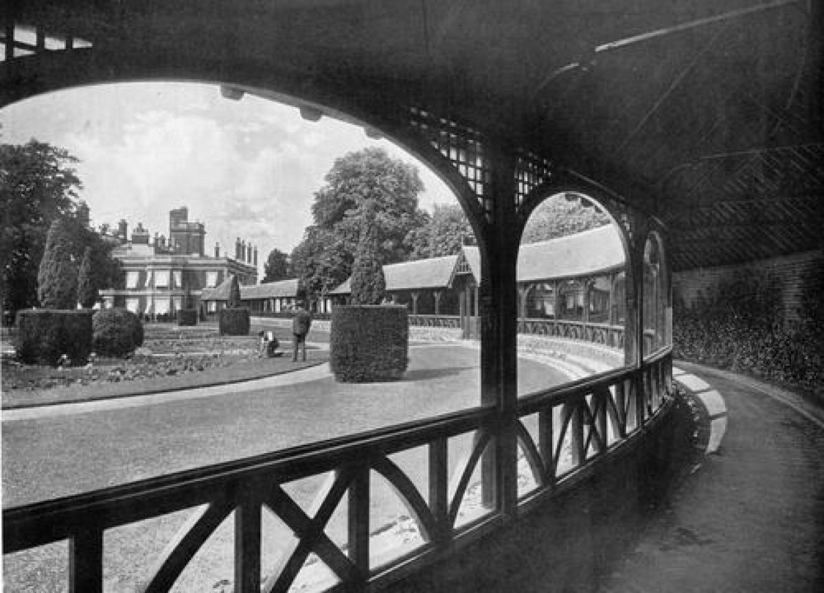 The garden consists of three circular areas known as the Sundial, Dutch and Fountain Gardens surrounded on one side by a semicircular Arts and Crafts inspired walkway. Country Life Illustrated 1899 remarked that ‘Variety is sought in the adornment of several special gardens, such as the fountain and sundial gardens ... These have something of a pleasing formality ... the beds of flowers are very attractive, and pyramidal golden yews add a pleasing note ... The curved corridor protecting one side of the garden is very unusual, and an interesting feature. Corridors in some ways analogous exist ... but the corridor at Worth Park is singular in having its opening filled with great sheets of glass, so that, within the glass, one is looking out through windows.'